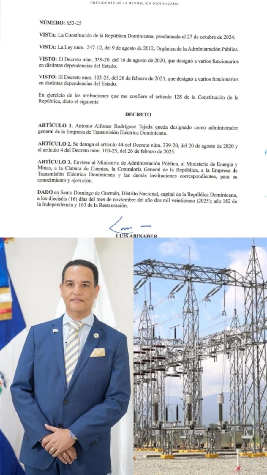 El Presidente Luis Abinader designa a Rodríguez Tejeda fue desinado mediante el decreto 635-25, luego de que el pasado 11 del presente mes se produjera un apagón nacional.
