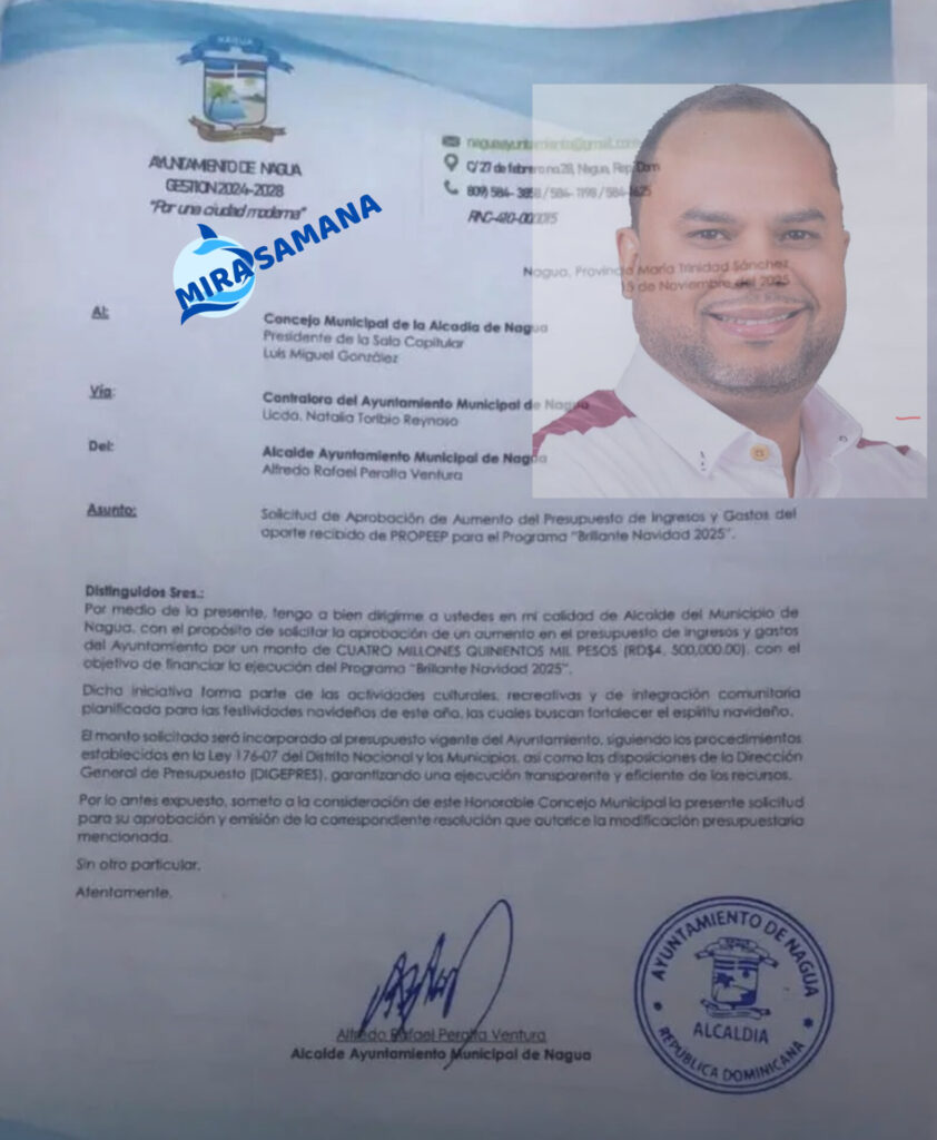 El alcalde Municipal Alfredo Rafael Peralta (Junior) sometió al Concejo Municipal una solicitud formal para la aprobación de un aumento presupuestario por RD$4.5 millones, recursos provenientes del programa PROPEEP (Proyectos Estratégicos y Especiales de la Presidencia), con la finalidad de financiar la iniciativa festiva “Brillante Navidad 2025”.