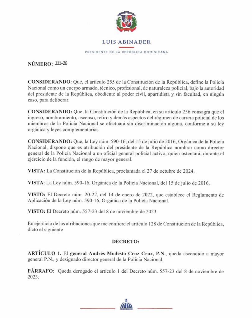Santo Domingo, R.D. El presidente Luis Abinader, dispuso el ascenso del general Andrés Modesto Cruz Cruz, P.N., al rango de mayor general y su designación como nuevo director general de la Policía Nacional, mediante el Decreto núm. 111-26.