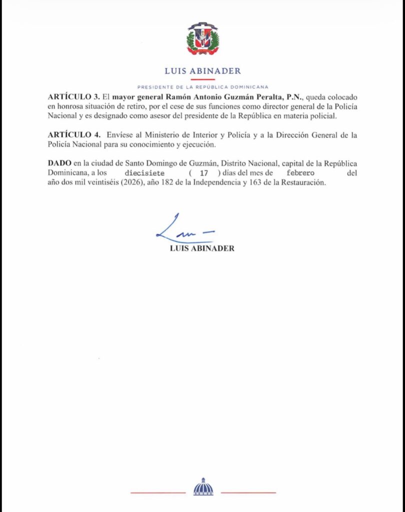 En la misma decisión, el mayor general Ramón Antonio Guzmán Peralta fue colocado en honrosa situación de retiro por el cese de sus funciones como director general de la Policía Nacional y designado asesor del presidente de la República en materia policial.