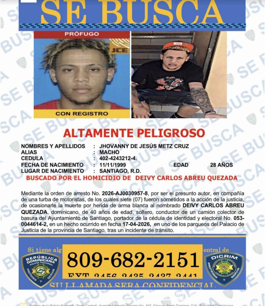 Santiago de los Caballeros. La Policía Nacional informó que mantiene una búsqueda activa contra Jhovanny de Jesús Metz Cruz, alias “Macho”, de 28 años, señalado como presunto autor del homicidio de Deivy Carlos Abreu Quezada, de 40 años, ocurrido el pasado 17 de abril de 2026 en esta ciudad.
